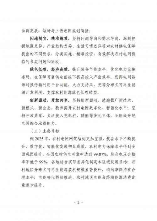 到2025年,农村电网网架结构更加坚强,装备水平不断提升,数字化、智能化发展初见成效,农村电力保障水平得到全面巩固提升,全国农村供电可靠率达到99.87%,综合电压合格率不低于99%,各地结合实际差异化制定本区域发展目标;农村地区分布式可再生能源装机规模显著提升,消纳率保持在合理水平;电能替代持续推进,农村地区电能占终端能源消费比重逐步提升。