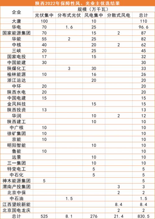 根据优选结果来看,大唐、华电、国家能源集团领衔前三,此外,华能、中核所获规模也均超过500MW,国家电投、中国能建等也均有所获。需要注意的是,陕煤化工、榆林能源、陕西水电等本地国企所获规模也较高,民营企业则由中环领衔。