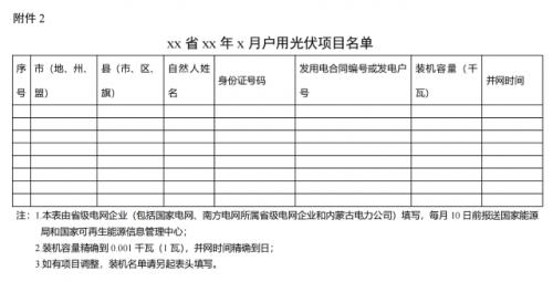 三、请相关省级能源主管部门组织地方电网企业于每月8日前按附件1、2向国家电网公司、南方电网公司所属省级电网企业和内蒙古电力公司报送户用光伏项目信息。各省级电网企业(含内蒙古电力公司)于每月10日前按附件1公布汇总后的全省户用光伏项目信息,于每月12日前按附件1、2报送国家能源局并抄送国家可再生能源信息管理中心。其中,附件2相关信息应与可再生能源发电项目建档立卡信息保持一致。