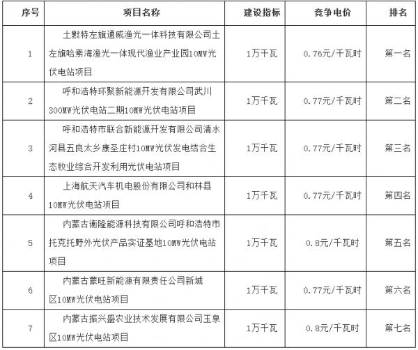 呼和浩特市2016年普通光伏电站项目评优结果
