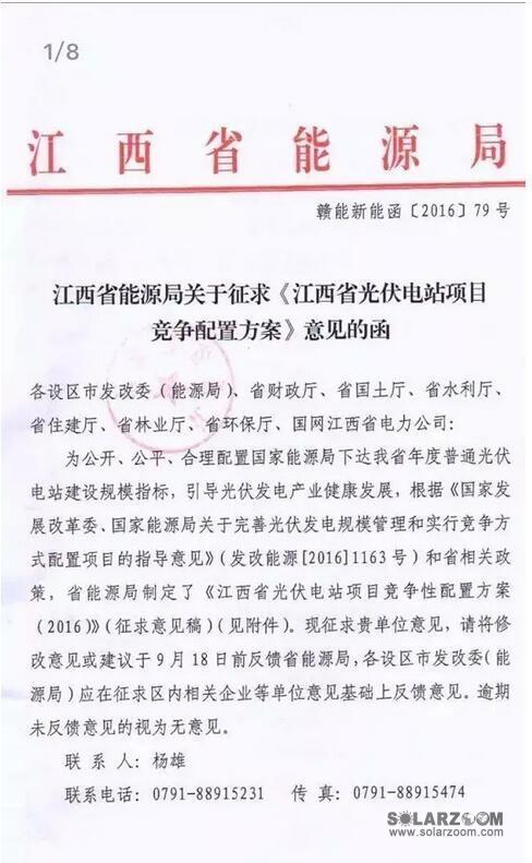 日前,江西省能源局发布关于《征求江西省光伏电站项目竞争配置方案》意见的函,拟对江西2016年400MW普通光伏电站建设规模指标进行分配。