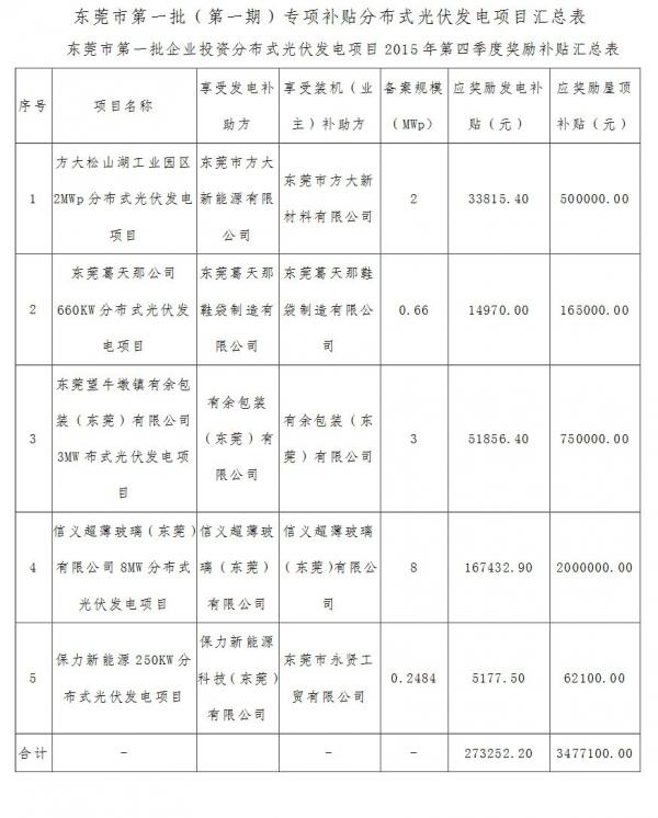2015年,东莞市发改委发布《关于组织申报东莞市分布式光伏发电资金补助项目的通知》(东发改〔2015〕303号)。今年,根据此《通知》,经供电部门统计、市发改局审核、市财政局复核,东莞市发改委确定第一批(第一期)分布式光伏发电项目专项补助资金3766787.53元(详见附件),第二批(第一、二期)分布式光伏发电项目专项补助资金共685801.23元(详见附件),第三批(第一期)企业分布式光伏发电项目专项补助资金共2189080.7元(详见附件),总计拨付6641669.46元分布式光伏发电项目专项补助资金。