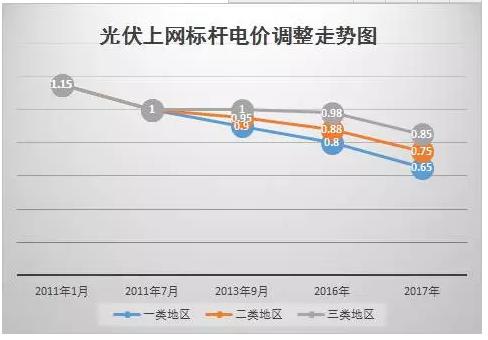 2017年1月1日之后,一至三类资源区新建光伏电站的标杆上网电价分别调整为每千瓦时0.65元、0.75元、0.85元。同时明确,今后光伏标杆电价根据成本变化情况每年调整一次。