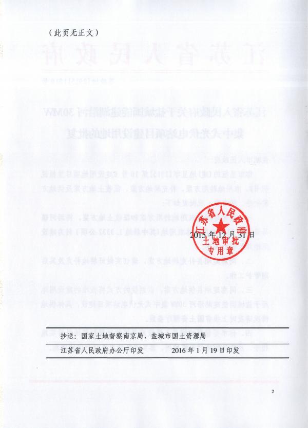 江苏省政府关于盐城国能建湖沿河30MW集中式光伏电站项目建设用地的批复