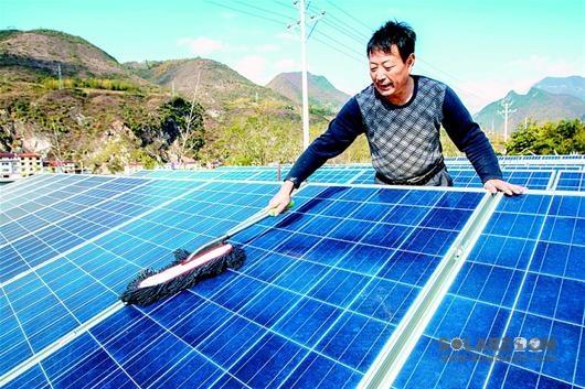 湖北日报讯昨日,技术人员在屋顶擦去太阳能板上的灰尘。近日,马桥镇洪权新能源科技开发公司光伏太阳能发电系统通过远程网络并入襄阳市供电网,成为保康县首例家庭光伏发电单位。据介绍,该发电系统由马桥镇马桥街村民饶鸿权投资300余万元建成,设计年发电100千伏,每年可实现收入10万元以上。