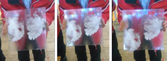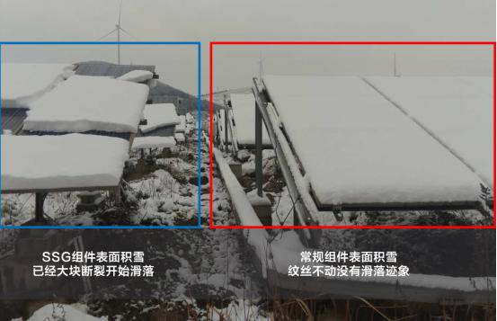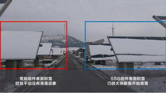 2016年11月22日,徐州协鑫光伏电站迎来入冬的第一场大雪,积雪厚度约为15CM,根据电站现场观察发现,使用SSG的组件相比正常的组件,积雪可以提前两天融化滑落(对比效果见下图)。而从发电数据也可以看出,同为500KW方阵,下雪后第一天,SSG方阵的平均发电量为25KWh,对比方阵的发电量则为6.3KWh;下雪后第二天,SSG方阵的平均发电量为957.5KWh,而对比方阵的发电量为458.3KWh,SSG方阵发电量是对比方阵的2倍多。据此估算,以20MW光伏电站为例,一场仅仅持续两天的积雪,使用SSG就能让每个方阵的发电量平均增发约520KWh,全站发电量增发约为21000KWh,按照当前三类资源区上网电价0.98元/W计算,全站增加收益约为20580元。