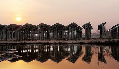 2月7日,在安徽六安市苏埠镇苏石大桥下,有着千年历史的淠河滩区上正在兴建起一座“渔光互补”光伏电站。
