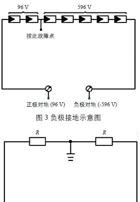 图4为中间接地故障等效电路图,故障组串有22个组件,假如测得A点对地电压绝对值为96 V,B点对地电压绝对值为596 V,由96/[(96+596)/22] ≈ 3可基本能够判定接地故障点在第3块组件附近。