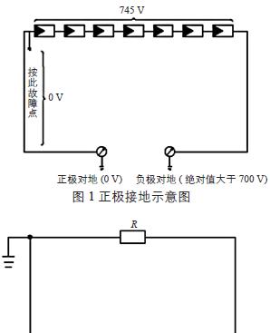 如图1所示,以正极接地故障为例,在测量故障组串正、负极进线端的对地电压时,正极电压为0 V或接近0 V,负极电压绝对值为700 V及以上。图2为正极接地故障等效电路图,可以测得A点对地电压为0 V,B点对地电压绝对值为700 V及以上,可快速有效地判定此为正极接地故障,此故障大多数由组串到光伏控制器的电缆破损所致。反之亦然。
