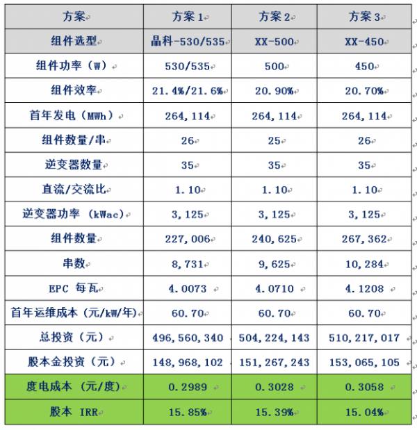 在既定的统一直流侧容量,土地可利用性和组件价格下,方案1选用的晶科530/535W组件比方案2和方案3在度电成本和收益率上都有很大的优势。主要体现在如下几个方面:
