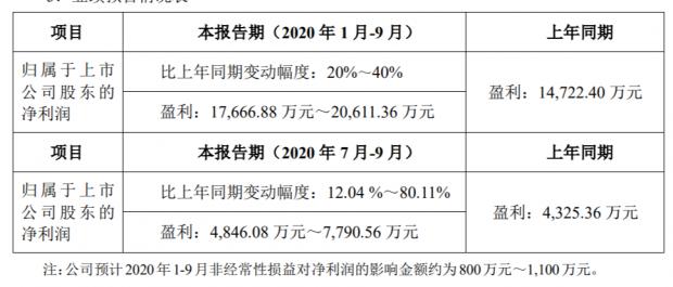 日前,回天新材发布2020年前三季度业绩预告,2020年1月1日–2020年9月30日归属于上市公司股东的净利润1.77亿元-2.06亿元,比上年同期增长20%-40%;其中第三季度盈利4,846.08万元-7,790.56万元,比上年同期增长12.04%~80.11%。