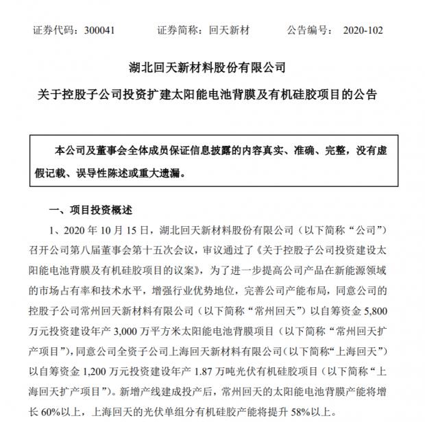 10月15日晚间,回天新材(300041)公告,为了进一步提高公司产品在新能源领域的市场占有率和技术水平,增强行业优势地位,完善公司产能布局,公司控股子公司常州回天以自筹资金5800万元投资建设年产3000万平方米太阳能电池背膜项目。