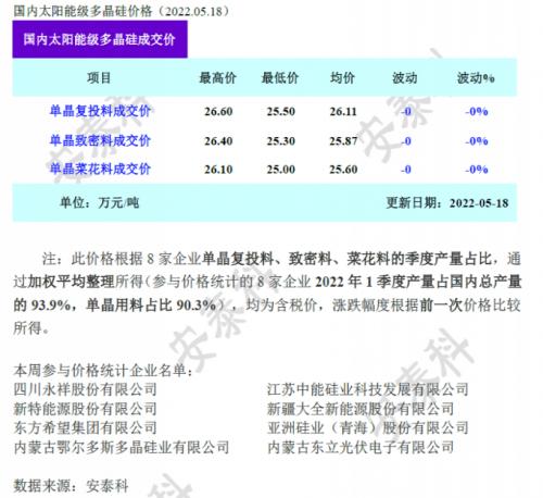 本周国内多晶硅价格持稳不变,主要是由于截止上周各硅料企业5月份订单几乎全部签订完毕,本周绝大多数企业无新订单成交,只有1-2家企业以上周价格签订极少量散单,故本周硅料均价持稳不变。目前多晶硅市场现状是:硅料紧缺现状持续,价格阶段性持稳。国内硅料企业包括现有在产企业和新进企业,都不同程度受到疫情影响,扩产产能虽增速放缓,但增量正逐月释放,但是即便如此,仍不及需求增量,部分具备投产条件的硅片产能因硅料不足无法提高产出,甚至部分一线硅片企业也因硅料不足有被迫降低开工率的可能,可见硅料紧缺的现状依旧持续。本周硅料价格持稳,主要原因是各多晶硅企业订单都已签订完毕,甚至有部分硅料交货期已至6月中旬,各企业无料可签;其次是由于近期硅片结构性库存未见减少,高价抢购散单的情况有所缓解。因此本周硅料市场价格呈现阶段性持稳态势。
