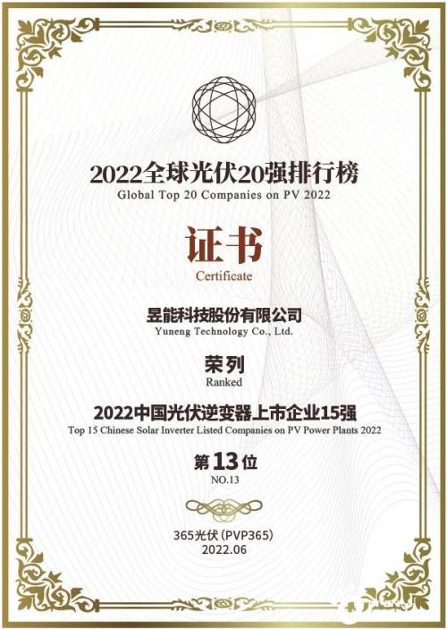 6月10日,由365光伏发起并主办的“2022全球光伏20强排行榜”正式全球发布。昱能科技股份有限公司凭借在逆变器领域的亮眼成绩以及突出技术创新成果,荣登“2022中国光伏逆变器上市企业15强”。