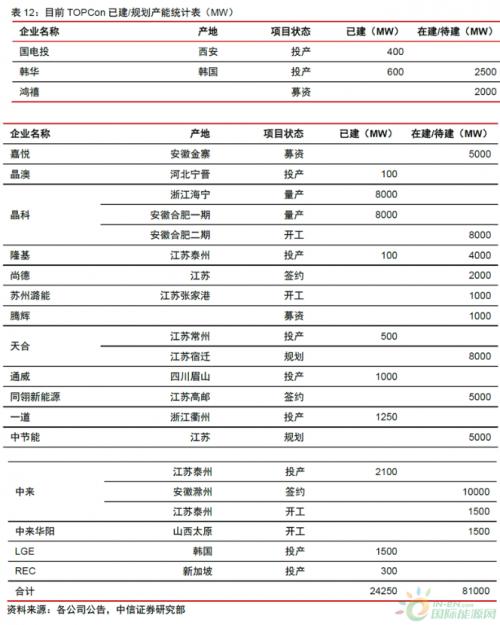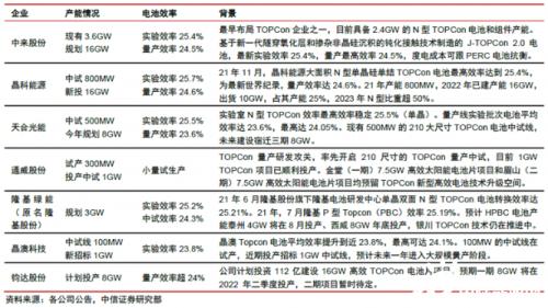 就几个重点发展TOPCon电池的公司来说,主要包括了晶科能源、中来股份、天合光能、晶澳科技、正泰新能、隆基股份和钧达股份等。