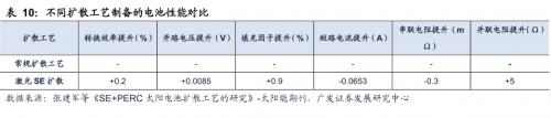 采用激光技术掺杂形成SE可提升TOPCon电池效率约0.2-0.3%。选择性发射极(Selectiveemitter,SE)结构是提高晶硅电池转换效率的重要方式,该结构特点是在接受光照的区域浅扩散形成低掺杂区,在金属电极下形成高掺杂区域,从而使得表面少子复合减少,金属电极与发射极之间形成良好欧姆接触,从而获得更高短路电流、开路电压和填充因子,从而提高转换效率,激光掺杂(laserdoping,LD)可在常温常压下形成SE结构,改善由高温导致的硅片表面损失。TOPCon激光硼掺杂技术是通过沉积或印刷硼掺杂源,在激光背面开槽过程中同步形成激光重掺杂区,降低背面接触复合速率及背面硅铝接触电阻,提升太阳电池开路电压Voc和填充因子FF,将转换效率0.5%。根据帝尔激光《2023年1月2日-2023年1月4日投资者关系活动记录表》,其通过激光工艺提升TOPCon转换效率约0.2-0.3%。