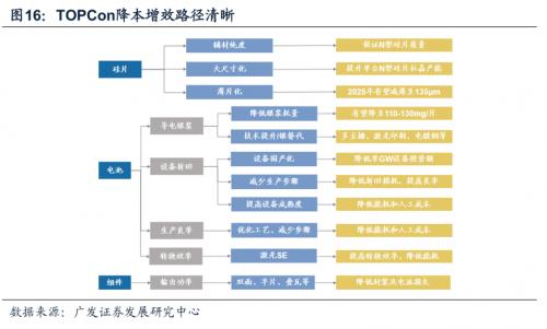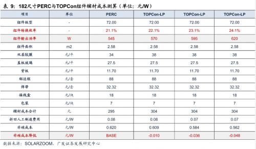 (2)非硅成本:根据我们测算,目前TOPCon非硅成本为0.21元/W,相较PERC高出0.05元/W,主要银浆增加约0.025元/W,设备增加带来折旧增加约0.005元/W,能耗增加约0.006元/W,良率及耗材增加0.014元/W,具体降本路径如下: