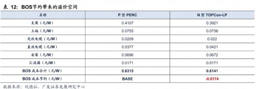 BOS节约带来的溢价空间:由于N型组件转换效率更高,从而在单位面积下的输出功率较高,因此在土地面积和组件数量相同的情况下,系统装机容量更大。但由于组件电性能参数不同、组件串联数不同,使得支架、电缆成本仍有差异。组件并联数的差异影响汇流箱成本,组件数量的差异则会影响土安装面积和人工安装成本。根据测算,N型TOPcon在BOS方面节约成本为0.0174元/W。
