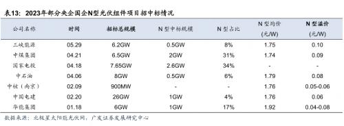 央企国企招标新贵,N型组件需求潮起。根据坎德拉在海南地面电站应用场景的仿真测算结果显示,在光资源较好、地表反射率较高的应用场景,在保持IRR相同时,与P型PERC组件相比,N型TOPcon组件的综合溢价空间为0.14-0.195元/W。23年以来,国家电投、中核汇能等国企组件招标中N型组件占比已提升至30%-40%。根据SMM数据,23年4月以来P型组件中标价处于1.63-1.73元/W区间内,N型组件中标价处于1.70-1.90元/W区间内,与P型相比,当前实际招标中国内N型组件已存在约0.04-0.10元/W溢价,率先投产的TOPCon厂商充分享受N型溢价红利。