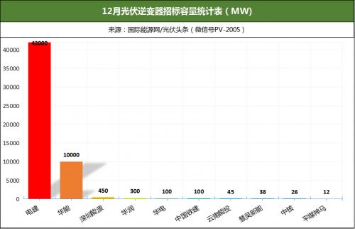 其中,华为中标4904MW,排名榜首;阳光电源中标2461MW,排名第二;国能龙源电气有限公司中标2088MW,排名第三。除此之外,株洲变流、固德威、正泰电源、禾望电气、日风电气、首航新能等企业也位列12月逆变器中标榜前十。
