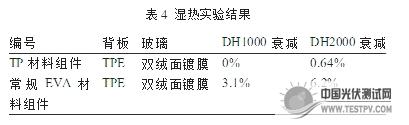 当阳光斜射入组件时,由于本身晶体结构的原因,光线会在材料内部不断进行反射,最终达到电池表面的光线会多于常规EVA封装的组件。因此TP材料的这一特性能够弥补组件在暴晒后光衰减过大的缺陷,从现有数据上看,在发电量上TP材料封装的组件不会低于常规EVA材料组件。湿热实验结果如表4所示。