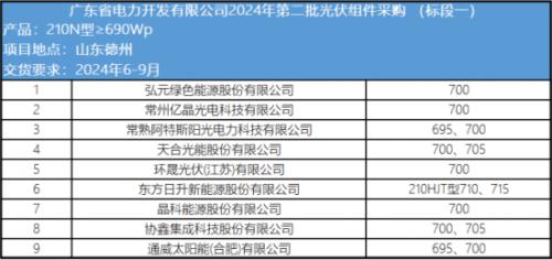 4月25日,广东省电力开发有限公司2024年第二批光伏组件采购开标(标段一,见下图)。开标文件显示,组件容量为118MW,型号为210N型双玻组件,要求功率在690W以上,投标型号为210N型双玻700W。