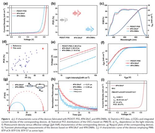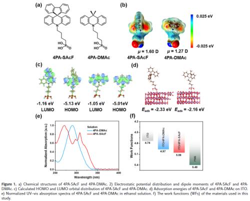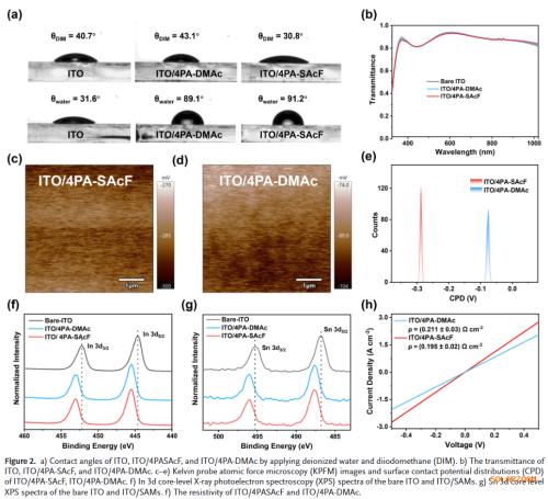 螺环分子结构优势:设计合成螺环构型自组装分子4PA-SAcF,具有更大偶极矩、更深HOMO能级和更强界面吸附能力,显著提升空穴提取与传输性能。