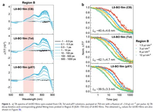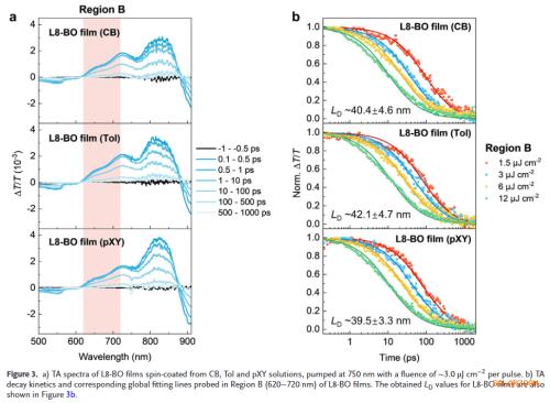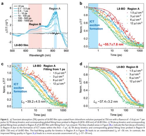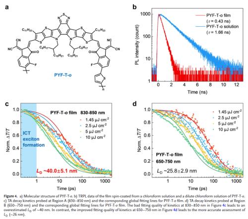 本文香港大学Philip C. Y. Chow等人指出,由于皮秒时间尺度上ICT激子形成导致光学带隙附近光谱演化,忽略此现象可能导致瞬态吸收数据分析中显著高估Y型NFA薄膜的LD。此外,在使用激子-激子湮灭模型进行数值拟合时,采用ICT激子的本征弛豫寿命对于可靠提取扩散系数和LD至关重要。