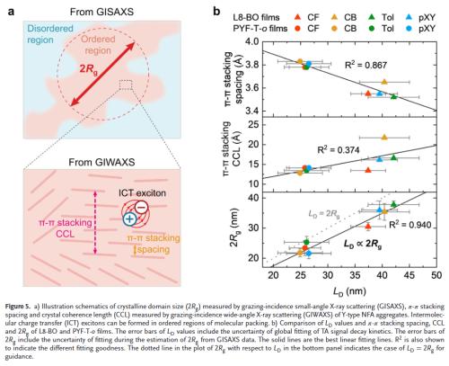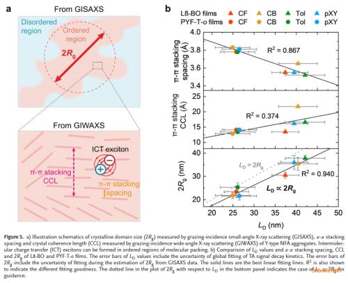 首次建立LD与晶域尺寸的直接关联通过GIWAXS/GISAXS分析,发现LD与π-π堆叠间距负相关,且与晶域尺寸(2Rg)高度匹配,表明晶域尺寸是限制激子扩散的关键因素,为通过调控晶域尺寸进一步提升LD指明方向。