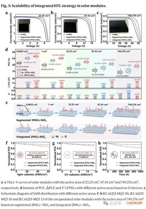 实现均匀稳定的空穴传输层(HTL)对大面积钙钛矿太阳能电池(PSCs)至关重要。然而,当前基于自组装单分子层(SAM)的HTL存在界面粘附力弱、薄膜均匀性差及稳定性有限等问题,制约了其规模化应用。本研究提出一种集成化HTL策略——在NiOx合成过程中进行原位SAM锚定,形成一类兼具可扩展性、高性能与高耐久性的HTL。该策略显著提升了分子有序度、能级匹配度及电荷提取效率,从而在大面积狭缝涂布模组中表现出更显著的性能提升。采用该HTL的PSCs实现了26.02%的冠军光电转换效率(活性面积为0.0655 cm²),大面积模组则分别获得22.80%(23.25 cm²)、21.45%(87.45 cm²)及20.21%(749.276 cm²,认证效率19.50%)的效率,展现出卓越的可扩展性。此外,该策略显著改善了辐照与热稳定性(商业化应用的关键挑战)。封装后的工业级模组成功通过了IEC 61215-2-2021标准中的三项模组质量测试(MQTs):户外暴露测试(MQT 08)、紫外预处理测试(MQT 10)及湿热工作寿命测试(MQT 13)。