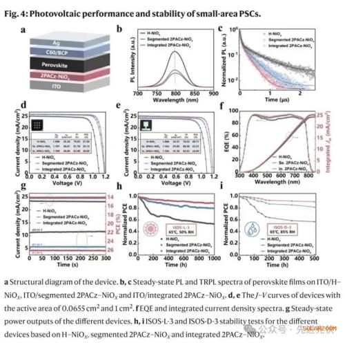 本研究系统评估了基于不同HTL的钙钛矿太阳能电池(PSCs)的光伏性能与稳定性表现。如图4所示,采用一体化2PACz-NiOx HTL的器件展现出卓越的综合性能:在0.0655 cm²活性面积上实现了26.02%的冠军效率(Voc=1.189 V,Jsc=26.06 mA/cm²,FF=83.98%),1 cm²器件效率达24.89%。TRPL测试显示载流子寿命从H-NiOx的464.51 ns降至212.41 ns,证实了空穴提取效率的提升。EIS分析表明一体化HTL器件具有更低的传输电阻(78.19 Ω)和更高的复合电阻(9101 Ω),TPV测试显示其非辐射复合抑制效果最佳(衰减时间344 μs)。在稳定性方面,一体化HTL器件在MPP跟踪下展现稳定的功率输出,通过ISOS-L-3(光浸泡)1000小时后保持88%初始效率,ISOS-D-3( shelf life)500小时后保持91%效率。SCLC和TAS测试进一步证实其界面缺陷态密度降至1.73×10¹⁵ cm⁻³,为商业化应用提供了可靠的技术支撑。