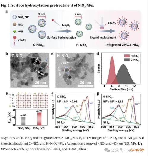 本研究创新性地开发了一种集成化HTL策略,通过Na₂O₂诱导NiOx表面羟基化,成功构建了高性能的化学锚定位点。如图1所示,该技术实现了三大突破性进展:首先,经Na₂O₂处理后NiOx平均粒径从9nm降至6nm,表面粗糙度降低48%,TEM图像清晰展示了颗粒分散性的显著改善;其次,FTIR和XPS分析证实-OH基团成功取代表面NO₃⁻,DFT计算显示-OH吸附能(-6.78eV)显著优于NO₃⁻(-4.60eV),XPS谱图更显示Ni³⁺/Ni²⁺比例提升22%;最后,这种表面改性形成了高活性NiOx基底,为2PACz分子提供了理想的锚定位点,最终使HTL导电性提升3倍,器件效率达到26.02%。这一系列创新成果为钙钛矿太阳能电池的界面工程提供了全新解决方案。