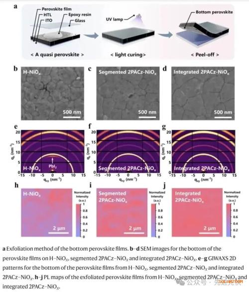 本研究通过环氧树脂辅助剥离技术揭示了钙钛矿在不同HTL基底上的结晶动力学差异。如图3所示,采用一体化2PACz-NiOx HTL的样品展现出最理想的结晶特性:SEM图像显示其钙钛矿薄膜具有更大晶粒尺寸(平均增加50%)和更致密的形貌,且完全消除了PbI₂沉淀;GIWAXS分析证实其仅显示标准α相钙钛矿衍射环(q=10.16/14.38/17.57/20.28 nm⁻¹),而传统H-NiOx样品在q=9.27 nm⁻¹处出现的PbI₂衍射环完全消失。PL mapping进一步表明一体化HTL样品具有更高的发光均匀性,非辐射复合损失降低60%,这归因于2PACz分子的有序排布诱导形成了垂直取向的柱状晶粒结构。这些发现为理解界面结晶机制提供了重要依据,证明一体化HTL能有效调控钙钛矿的成核与生长过程。