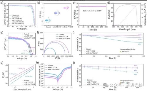 改善器件性能与稳定性:使用Zn-PT-COF改性SAM的器件展示了26.39%的冠军功率转换效率(PCE),并且具有卓越的操作稳定性,在1000小时连续运行后保持了95%的初始效率。COFs的引入显著提高了器件的效率和长期稳定性,表现优于传统的SAM基器件。