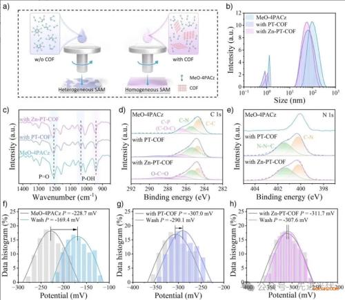MeO-4PACz与COFs共组装后,聚集状态显著改善,形成了均匀的自组装单分子层(SAM)。在乙醇溶液中,MeO-4PACz形成的胶束大小约为96 nm,而与PT-COF和Zn-PT-COF共组装后,聚集体大小分别减小至63 nm和55 nm。这一尺寸减小是由于COFs与MeO-4PACz之间的强π-π相互作用和氢键,打破了分子聚集。改善的分散性有助于形成均匀的SAM,从而促进钙钛矿薄膜的沉积。FTIR分析表明,COFs与MeO-4PACz之间形成了氢键,XPS和ToF-SIMS结果进一步确认了COFs成功融入SAM。通过KPFM测量发现,加入COFs后,SAM的接触电势差(CPD)显著降低,表面电荷变得更加正向,降低了空穴传输障碍并抑制了非辐射复合。