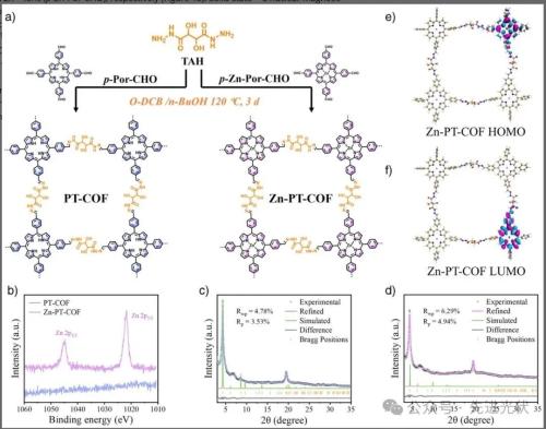 两种新型共价有机框架(COFs),PT-COF和Zn-PT-COF,分别通过酒石酸二肼与刚性连接体(p-Por-CHO)反应以及与Zn²⁺离子配位的p-Por-CHO合成成功。通过NMR、FTIR和XPS表征,证实了COFs的成功合成。PXRD分析显示COFs具有结晶结构,HRTEM图像确认其为圆盘状,EDS表明C、N、O和Zn元素均匀分布。热重分析表明,COFs具有良好的热稳定性,满足光电设备的要求。紫外-可见吸收谱表明,Zn掺杂的Zn-PT-COF带隙较小,电荷离域化更好。DFT计算表明,COFs的电子特性主要由卟啉的π电子主导,Zn金属化改善了能级对齐,促进了电荷传输。