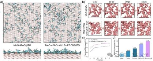 为了更好地理解MeO-4PACz与Zn-PT-COF之间的相互作用,我们使用分子动力学(MD)模拟,将它们混合在12 nm × 12 nm的ITO表面上进行研究。结果显示,在没有COFs的情况下,MeO-4PACz在ITO表面聚集,而在Zn-PT-COF的帮助下,MeO-4PACz的聚集显著减少,形成了更加均匀的单分子层。此外,MeO-4PACz在分子运动中会形成二聚体、三聚体和四聚体,导致钙钛矿界面出现缺陷。通过计算结合能,发现COFs与MeO-4PACz的相互作用比MeO-4PACz的二聚体、三聚体和四聚体更强,表明COFs通过π-π相互作用和氢键有效抑制了MeO-4PACz的聚集,促进了均匀SAM层的形成。