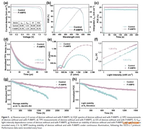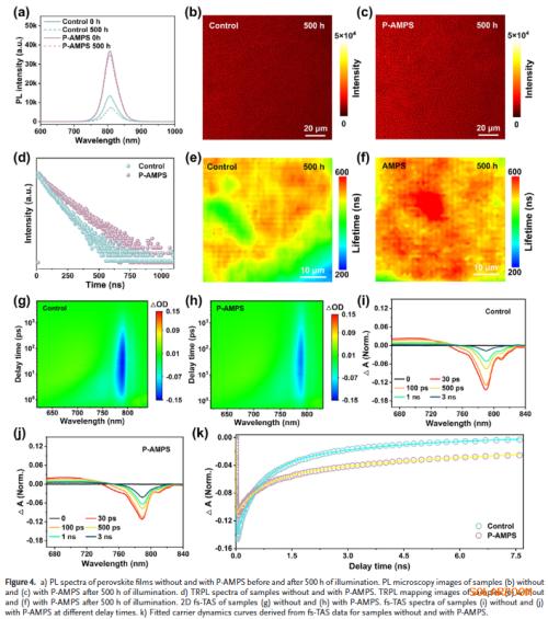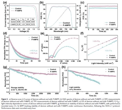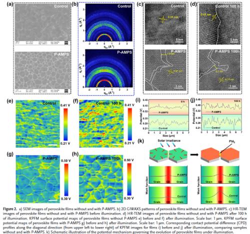多机制协同增强结构与光电性能:P-AMPS不仅作为应力缓冲层,还通过其官能团钝化缺陷、抑制离子迁移,提升结晶质量与载流子寿命。