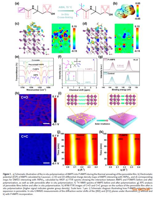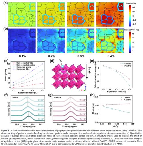 原位聚合柔性聚合物实现晶粒物理隔离:通过AMPS单体在退火过程中原位聚合形成P-AMPS柔性网络,有效隔离钙钛矿晶粒,缓解光致晶格膨胀与应力积累。