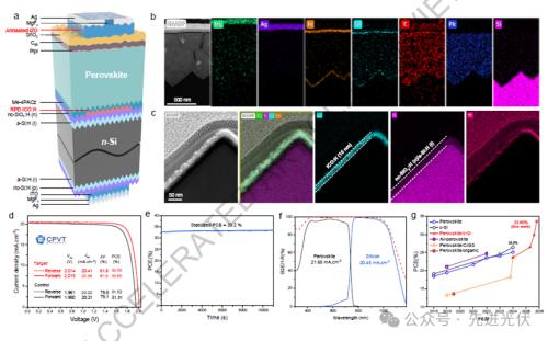 图1展示了柔性钙钛矿/晶硅叠层太阳能电池的器件结构与关键性能。电池采用超薄(约65 μm)硅异质结底电池,其双面亚微米纹理结构为钙钛矿顶电池的共形生长提供了理想界面。截面SEM与HAADF-STEM分析显示,钙钛矿层在纹理硅表面形成致密、垂直取向的大晶粒。冠军器件认证效率达33.6%,开路电压创2.015 V纪录,稳态功率输出达33.2%。EQE谱验证了子电池电流的良好匹配,顶电池与底电池分别贡献21.65 mA/cm²和20.45 mA/cm²的电流输出。