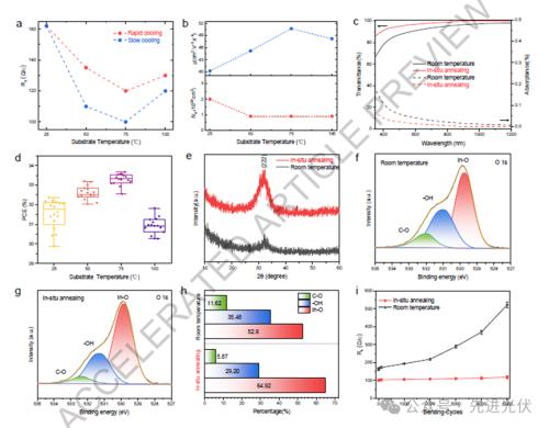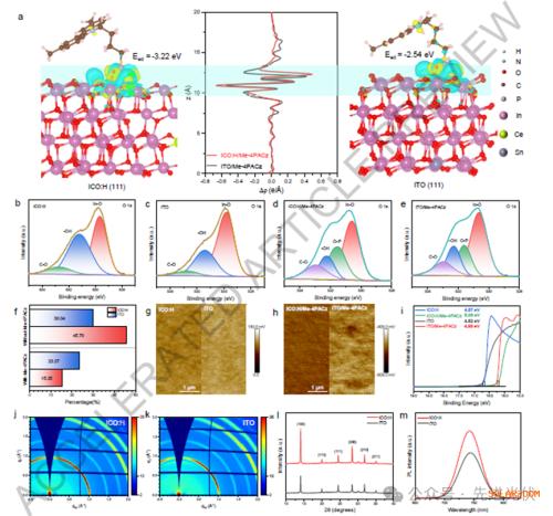 采用反应等离子体沉积技术制备的Ce/H共掺氧化铟(ICO:H),在界面特性上实现了质的飞跃。ICO:H不仅具备超高载流子迁移率和低沉积损伤等优异本征特性,更在界面工程中发挥关键作用:其表面提供更丰富的锚定位点,显著增强了自组装单分子层(SAM)的吸附强度与覆盖密度。