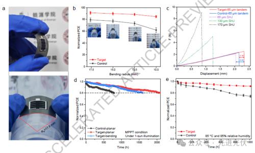图2系统评估了柔性叠层电池的机械耐久性与长期稳定性。弯曲测试表明,器件在17.6 mm弯曲半径下经历5000次循环后仍保持91.2%的初始效率,即使在10 mm极限曲率下也能维持84.8%的性能,展现出卓越的机械鲁棒性。三点弯曲测试显示,钙钛矿顶层的引入将器件开裂时的垂直位移从2.04 mm提升至2.34 mm,有效增强了整体结构的抗应变能力。稳定性方面,连续光照下MPP跟踪的T80寿命超过2000小时,在85°C/85%RH湿热老化1000小时后仍保留90%的初始效率,性能衰减率显著低于对照组。这些数据充分验证了该柔性叠层电池在实际应用场景下的可靠性。