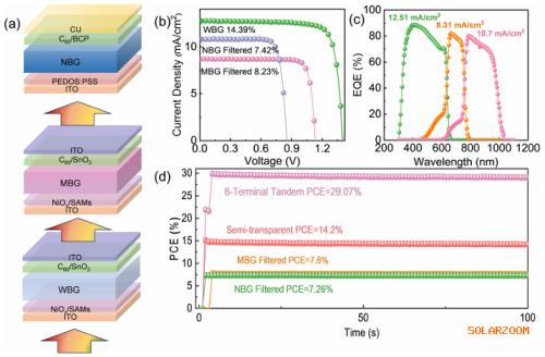 因此,单结1.95 eV带隙钙钛矿太阳能电池实现了15.93%的功率转换效率,具有1.40 V的高开路电压和0.83的填充因子。此外,采用1.95 eV、1.60 eV和1.25 eV钙钛矿光吸收层的机械堆叠三结全钙钛矿叠层太阳能电池的效率超过30%。因此,这项工作为优化高溴含量钙钛矿提供了一种简单有效的策略,从而能够开发高效宽带隙钙钛矿和多结叠层太阳能电池。