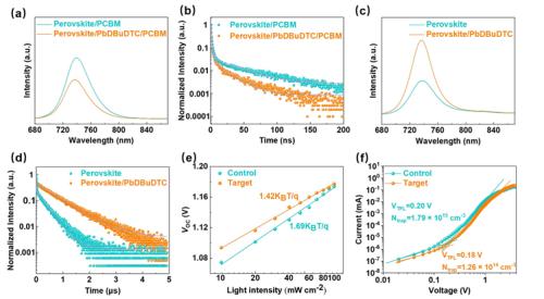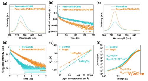 图4. (a)含PCBM的对照和目标钙钛矿膜的PL和(b) TRPL光谱。(c)不含PCBM的对照和目标钙钛矿膜的PL和(d) TRPL光谱。(e)开路电压(VOC)对光强的依赖性。(f)对照和目标电子器件的暗I-V曲线。