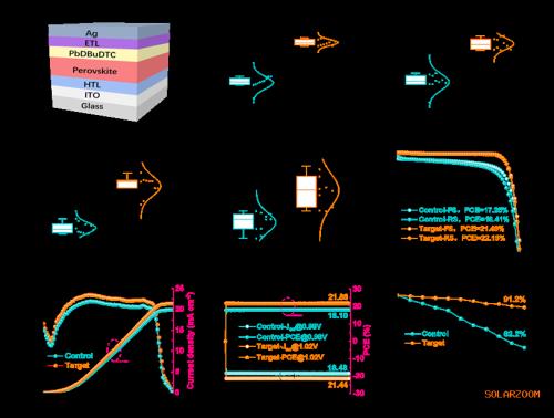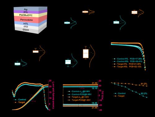 本研究证明,PbDBuDTC作为一种多功能界面修饰剂,可同步调控钙钛矿晶界的电子特性并高效钝化缺陷。通过结合开尔文探针力显微镜与理论计算,我们发现PbDBuDTC能够引发晶界处电势分布的显著反转,将局部电子结构从p-n-p构型转变为n-p-n构型,从而促进载流子分离与传输。第一性原理计算与系统表征进一步证实,PbDBuDTC的官能团可有效钝化钙钛矿晶格中的空位缺陷,抑制非辐射复合。这些效应的协同作用使得采用PbDBuDTC的反式钙钛矿太阳能电池实现了22.2%的光电转换效率,为完全在环境空气中制备的1.68 eV宽带隙钙钛矿太阳能电池设立了新标杆。此外,PbDBuDTC独特的分子结构(具有四个疏水性丁基基团)及其抑制碘离子氧化为碘单质的本征能力,赋予器件优异的环境稳定性—在环境空气(25°C ± 5°C,30% ± 10% RH)中存储1000小时后,仍能保持初始光电转换效率的90.7%。