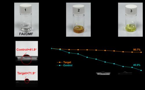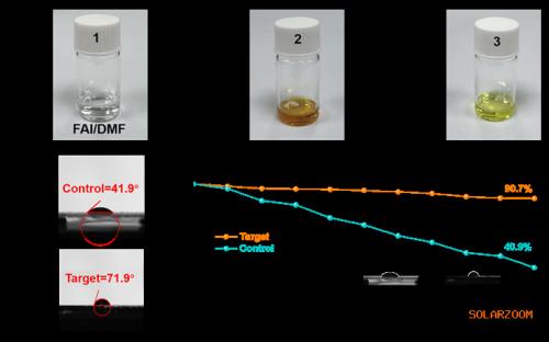 图6. (a) (1)未氧化的FAI在DMF溶液中的照片,(2)氧化的FAI在DMF溶液中的照片,以及(3)经PbDBuDTC还原的FAI在DMF溶液中的照片。(b)对照钙钛矿薄膜和(c)目标钙钛矿薄膜上水滴的接触角。(d)未封装的对照钙钛矿薄膜与目标钙钛矿薄膜在25 °C ± 5 °C和30 % ± 10 %相对湿度条件下的储存稳定性。