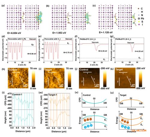 图2. PbDBuDTC钝化FAPbI3(100)晶面时(a) Pb2+填充V_Pb、(b) S填充V_I和(c) N填充V_I的结合能和差分电荷密度。含有(d) V_Pb和(e) V_I的钙钛矿功函数的DFT计算。 PbDBuDTC分子在(f) S-V_I和(g) N-V_I状态下的功函数的DFT计算。 (h)对照和(i)目标钙钛矿膜的原子力显微镜。(j)对照和(k)目标钙钛矿膜的KPFM。(l)对照膜和(m)目标膜对应区域的相对VCPD线扫描光谱。图h-k中三个线扫描区域用白线(“1”、“2”、“3”)标记。相对VCPD线扫描光谱(l, m)分别显示了从线“1”中提取的对照膜和目标膜的数据。从“2”和“3”线扫区域提取的相应数据见补充图S12和S13.(l)和(m)中的垂直透明矩形作为导向,将形貌特征(例如GBs)与其相应的CPD对齐,从而实现膜形貌和功函数之间的直接空间关联。(n)对照膜和(o)目标膜的CPD和GBs与GIs之间的能带弯曲。示意图,其中“−”表示电子,“+”表示空穴。