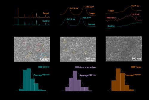 图3. (a)转移和处理过程中对照和目标钙钛矿膜在空气暴露下的XRD谱图。(b)对照和目标钙钛矿膜中pb 4f的XPS光谱。(c)对照钙钛矿膜、PbDBuDTC膜和目标钙钛矿膜中S 2p的XPS光谱。(d)未钝化和二次退火的钙钛矿膜的表面SEM图像,(e)只进行了二次退火的钙钛矿膜,(f)同时进行了钝化和二次退火的钙钛矿膜。(g)未经过钝化和二次退火的钙钛矿薄膜,(h)只经过二次退火的钙钛矿薄膜,(i)同时经过钝化和二次退火的钙钛矿薄膜的晶粒尺寸分布。