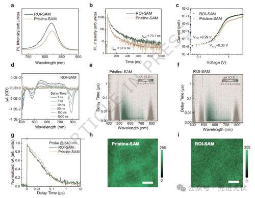 图3聚焦光电性能提升,通过PL、TRPL、SCLC等表征证实:ROI-SAM体系PL强度更高、衰减寿命更长(73.1 ns),非辐射复合减少;陷阱填充极限电压更低(0.29 V),缺陷密度降低;TA测试显示电荷提取更高效;PLmapping和形貌表征表明钙钛矿薄膜更均匀,晶粒更大,为器件高效运行提供性能支撑。定基础。