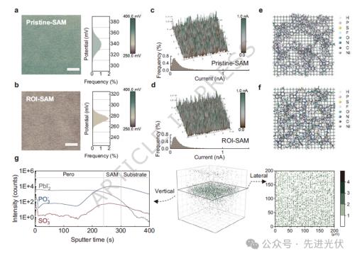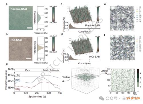 图2聚焦SAM在NiOₓ表面的分布特性,通过KPFM、c-AFM、分子模拟和TOF-SIMS证实:ROI-SAM体系电势与电流分布更均一(标准差14.5 mV、RMS 0.134 nA),分子分散性提升;SO₃⁻与PO₃⁻深度一致且横向分布均匀,证明SAM层覆盖全面、结合稳定,为电荷传输优化奠定基础